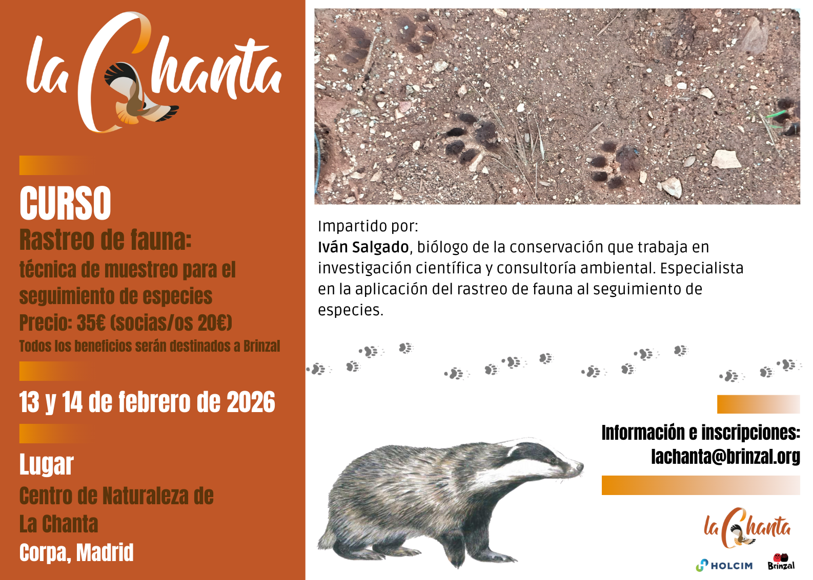 El curso lo impartirá Iván Salgado, especialista en biología de la conservación, por formación académica (licenciado en biología y máster en biología de la conservación) y experiencia profesional (en investigación científica y consultoría ambiental). Este curso pretende formar en la técnica de rastreo de mamíferos, preparando a los participantes para encontrar y determinar los rastros de fauna y poder aplicarlos al seguimiento de especies.